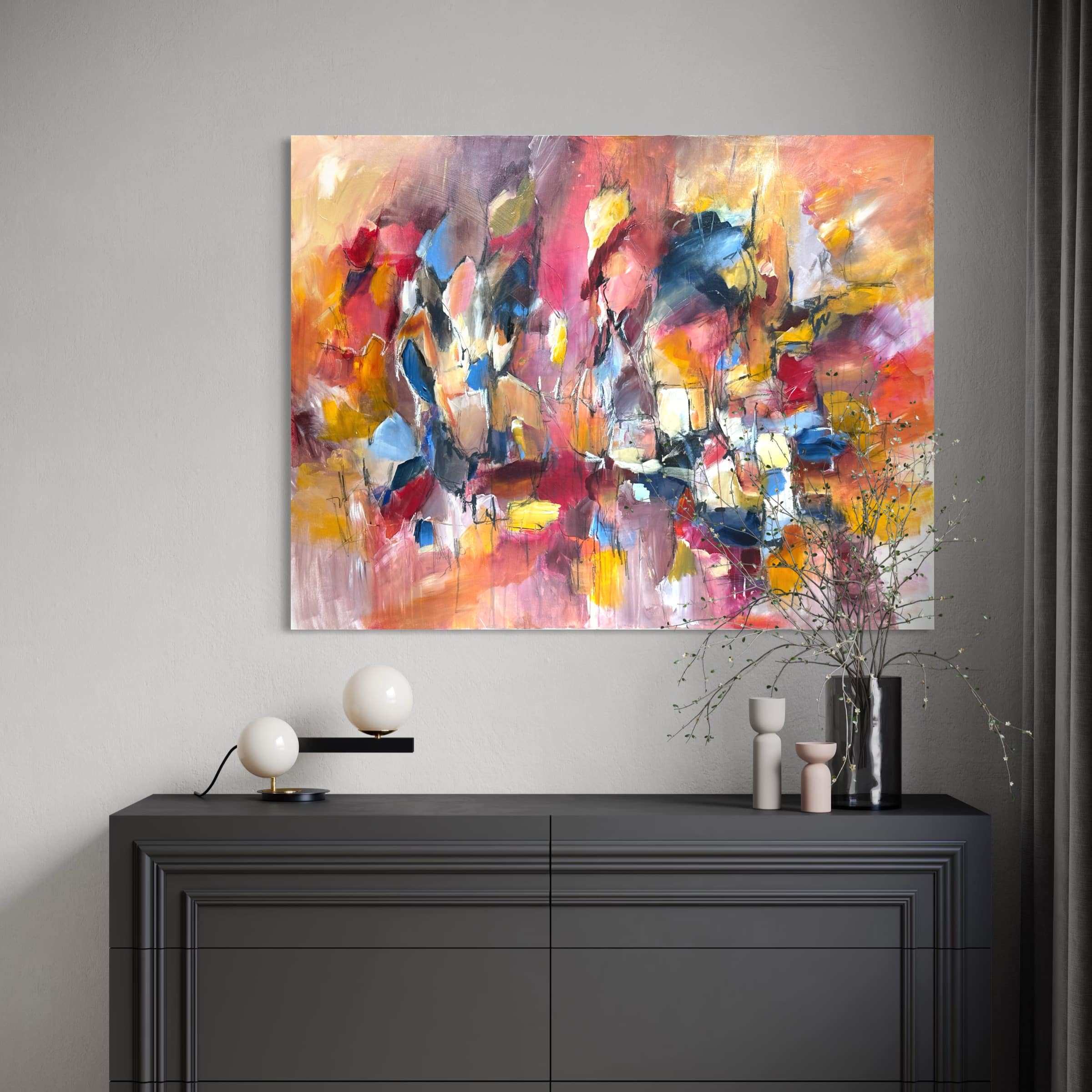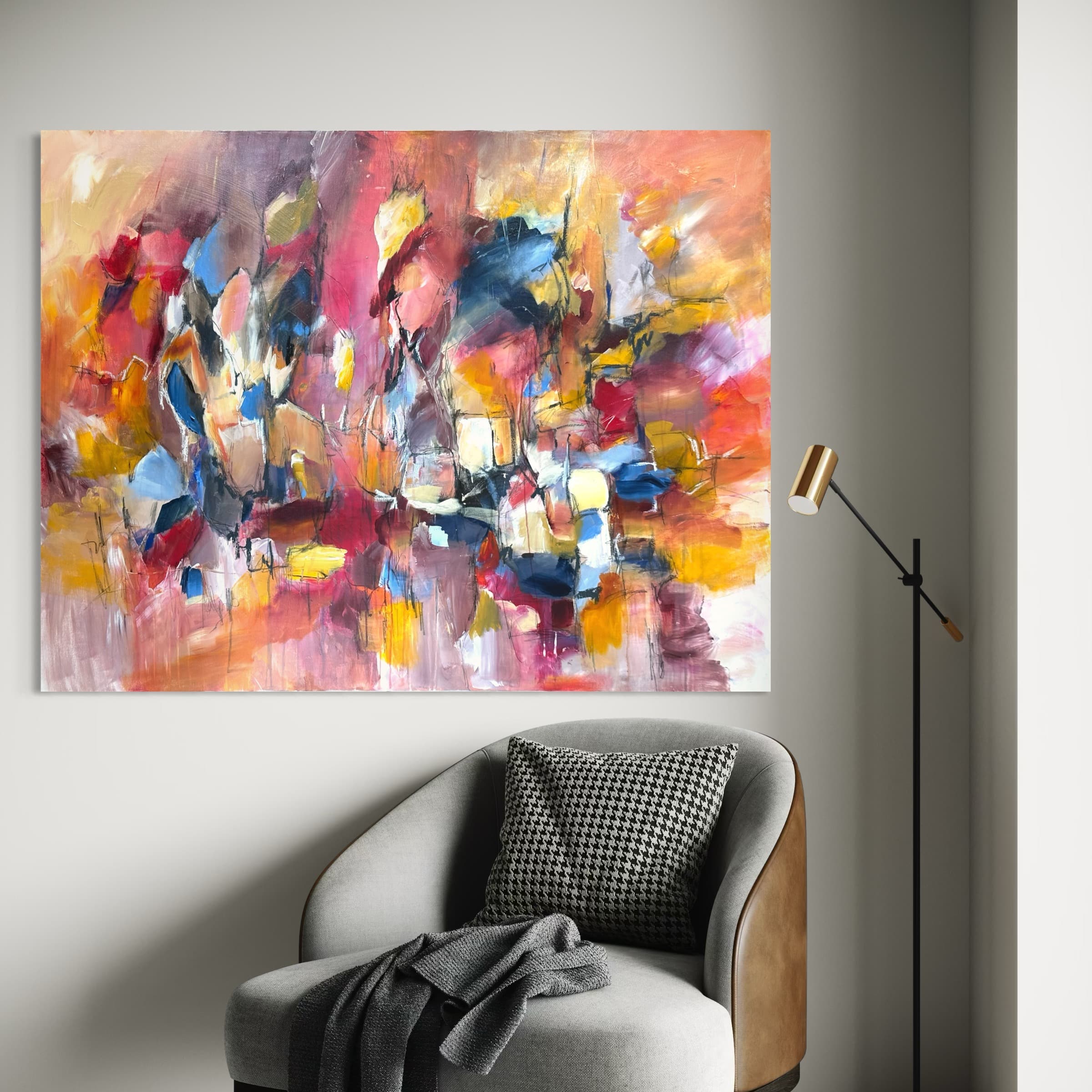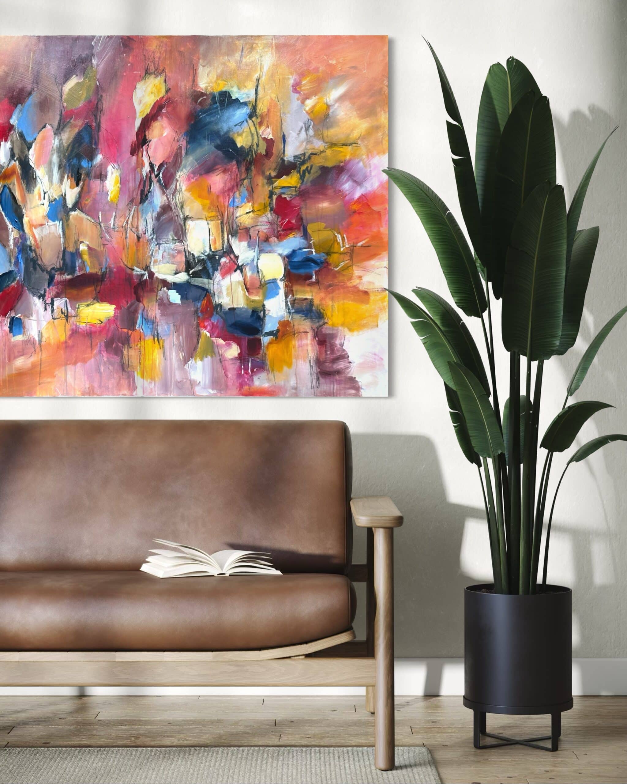 Primært, da det er mere sikkert end fragt med en transportør. Samtidig vil jeg også gerne vise dig maleriet i mit studies inspirerende rammer, og give dig tips og tricks til placering og styling af dit maleri.