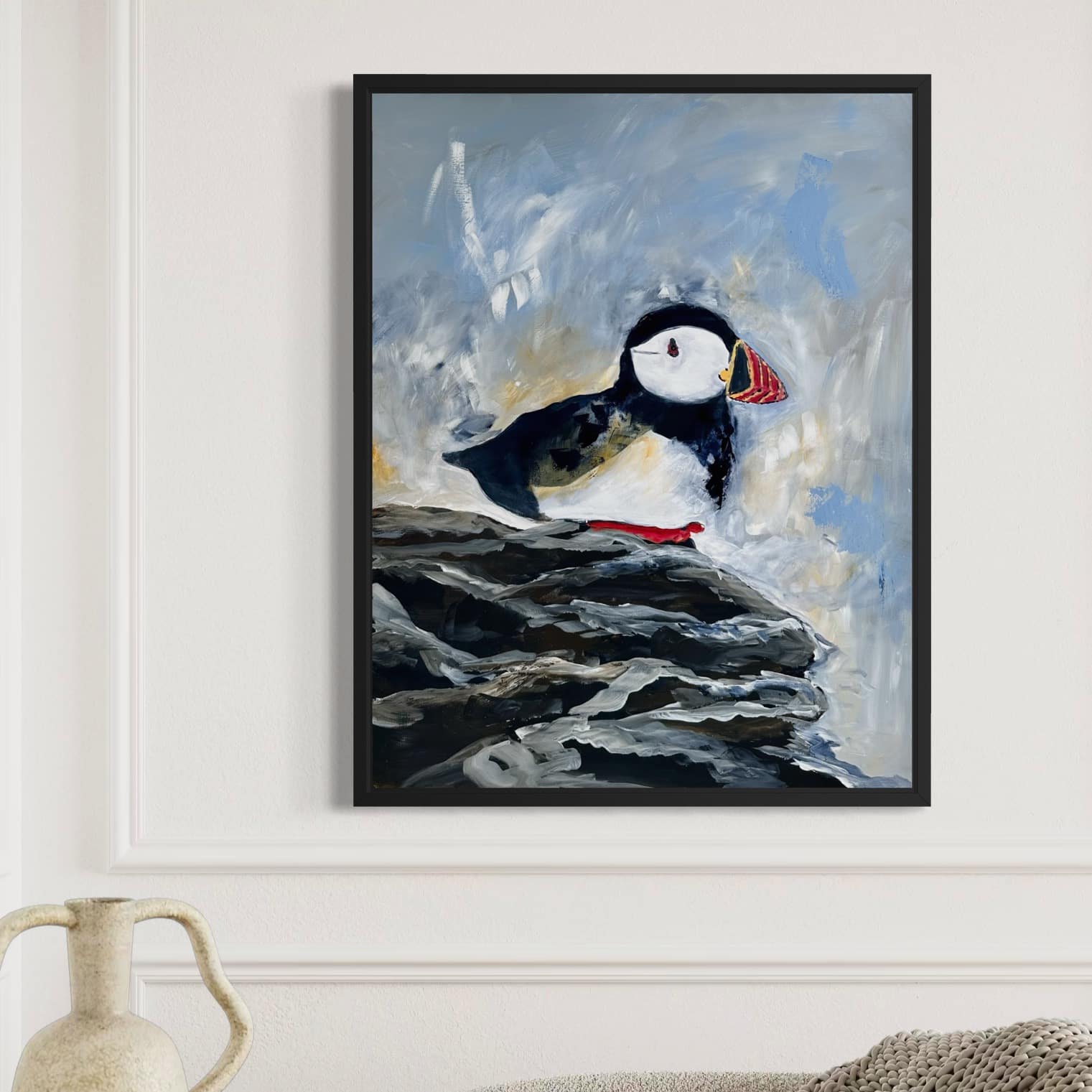Primært, da det er mere sikkert end fragt med en transportør. Samtidig vil jeg også gerne vise dig maleriet i mit studies inspirerende rammer, og give dig tips og tricks til placering og styling af dit maleri.