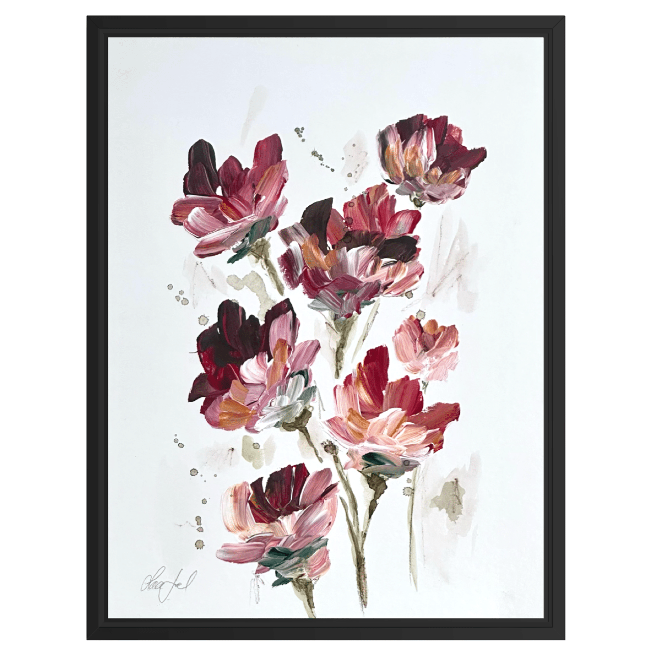 Alle værker er unikke og originale, og monteret i en sort træramme med en smule træstruktur.