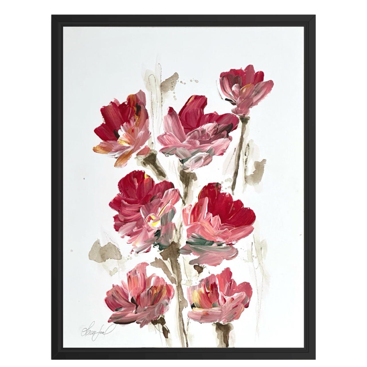 Alle værker er unikke og originale, og monteret i en sort træramme med en smule træstruktur.
