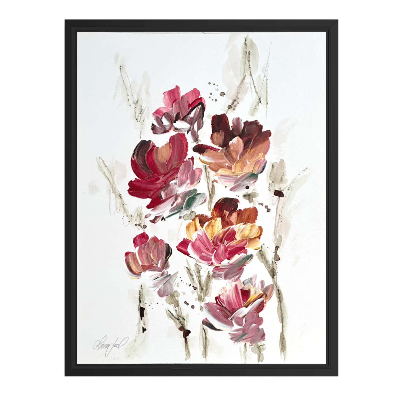 Alle værker er unikke og originale, og monteret i en sort træramme med en smule træstruktur.