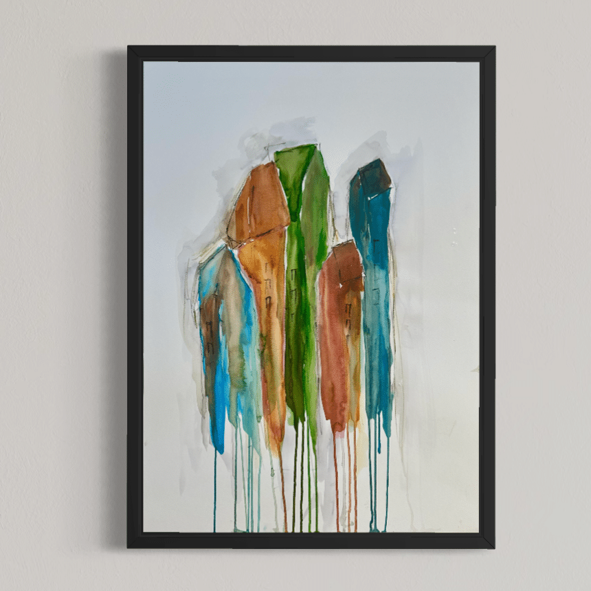 Alle værker er unikke og originale, og monteret i en sort træramme med en smule træstruktur.