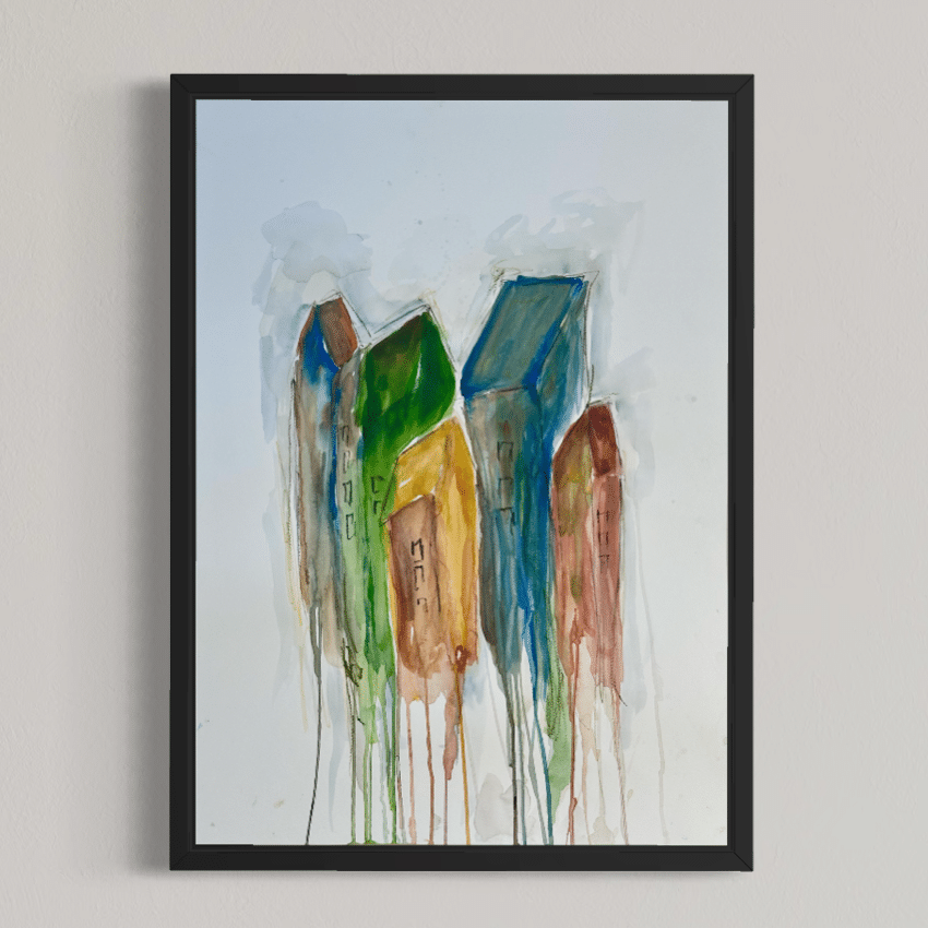 Alle værker er unikke og originale, og monteret i en sort træramme med en smule træstruktur.