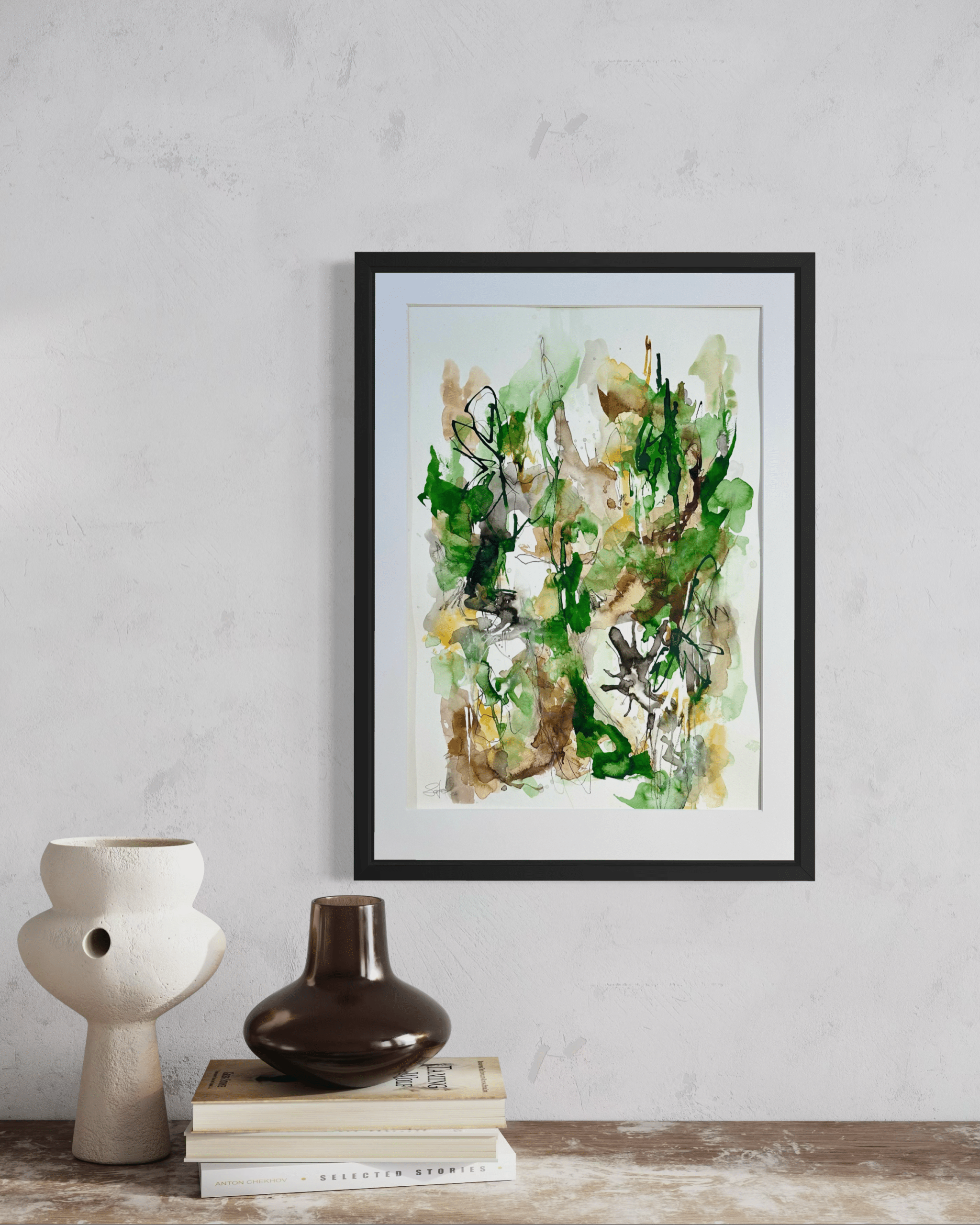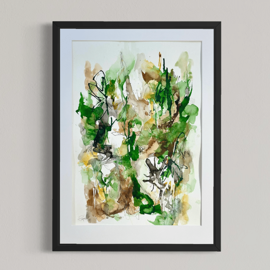 Alle værker er unikke og originale, og monteret i en sort træramme med en smule træstruktur.