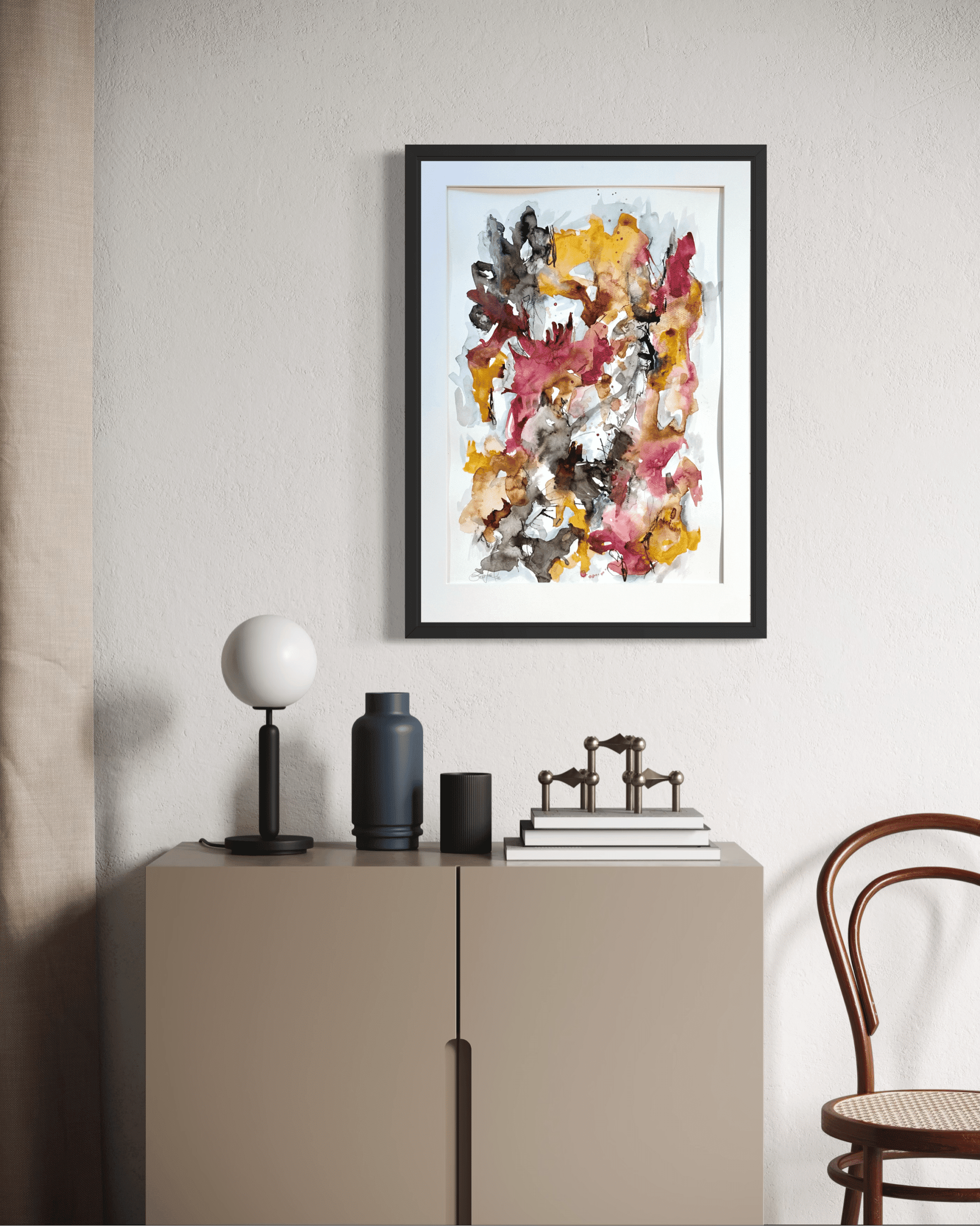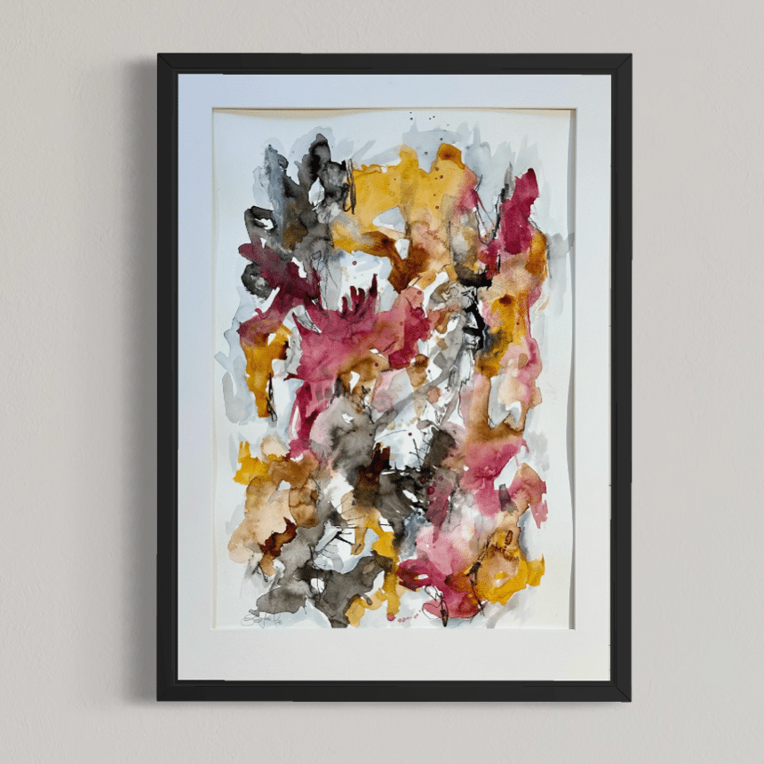 Alle værker er unikke og originale, og monteret i en sort træramme med en smule træstruktur.